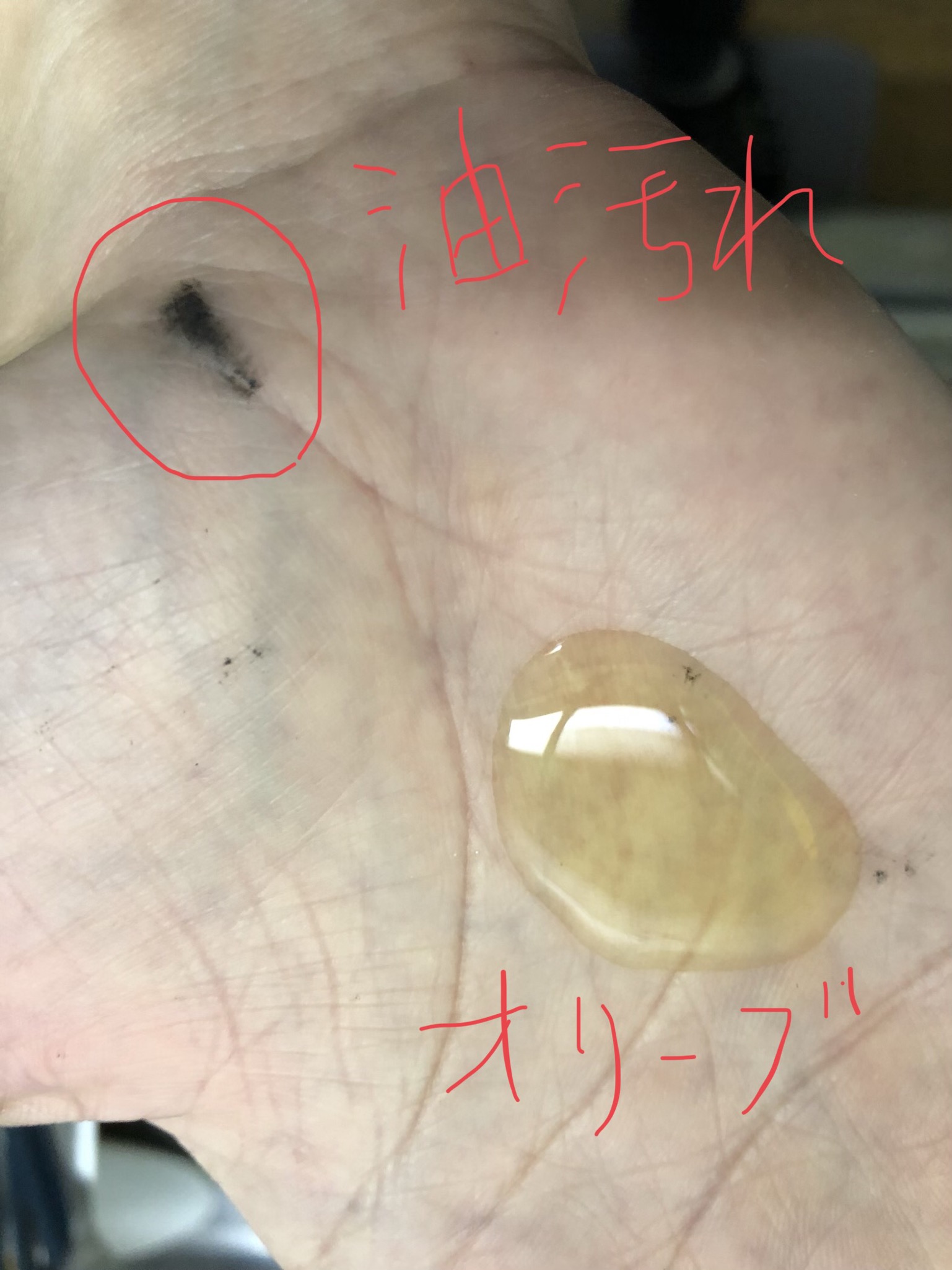 自転車のチェーンの油汚れが手についてしまったら、まずはオリーブオイルを手につけます。↓
