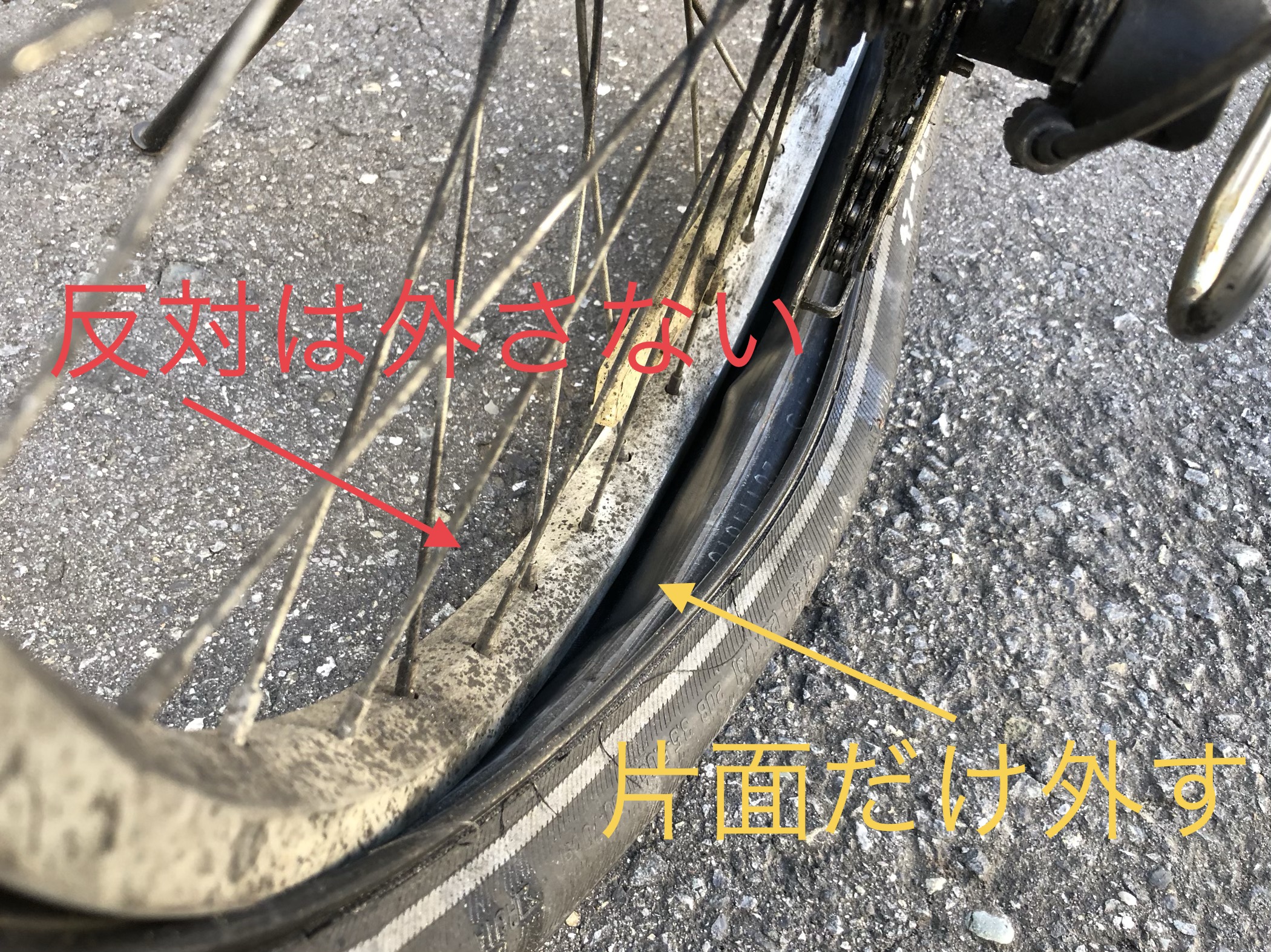 タイヤは片面だけリムからはずせばOK です。両面はずす必要はありません。↓