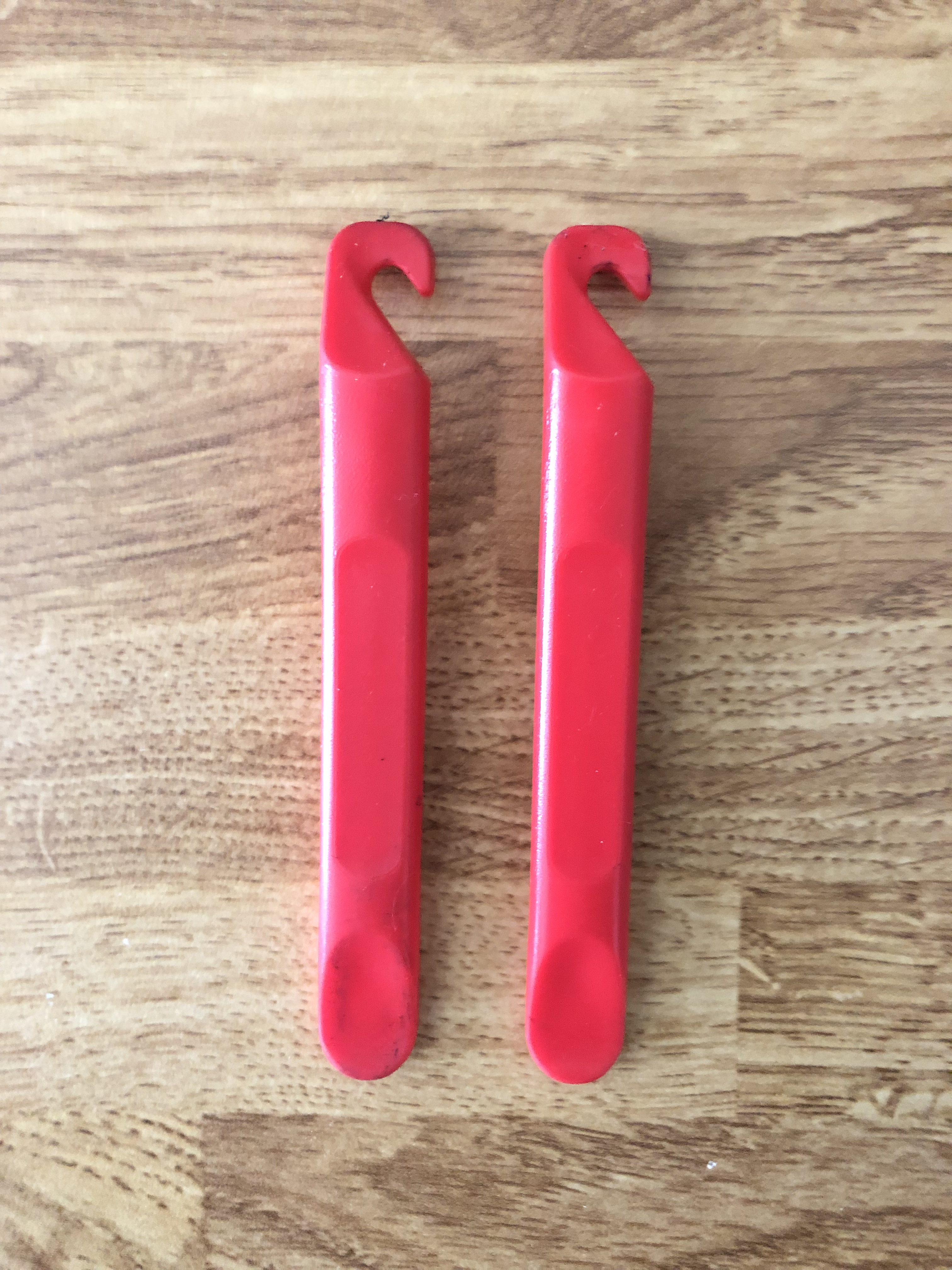 タイヤとリムを外すときは、『自転車用パンク修理セット』の中に入っているこの道具を使います。タイヤレバーと言います。↓