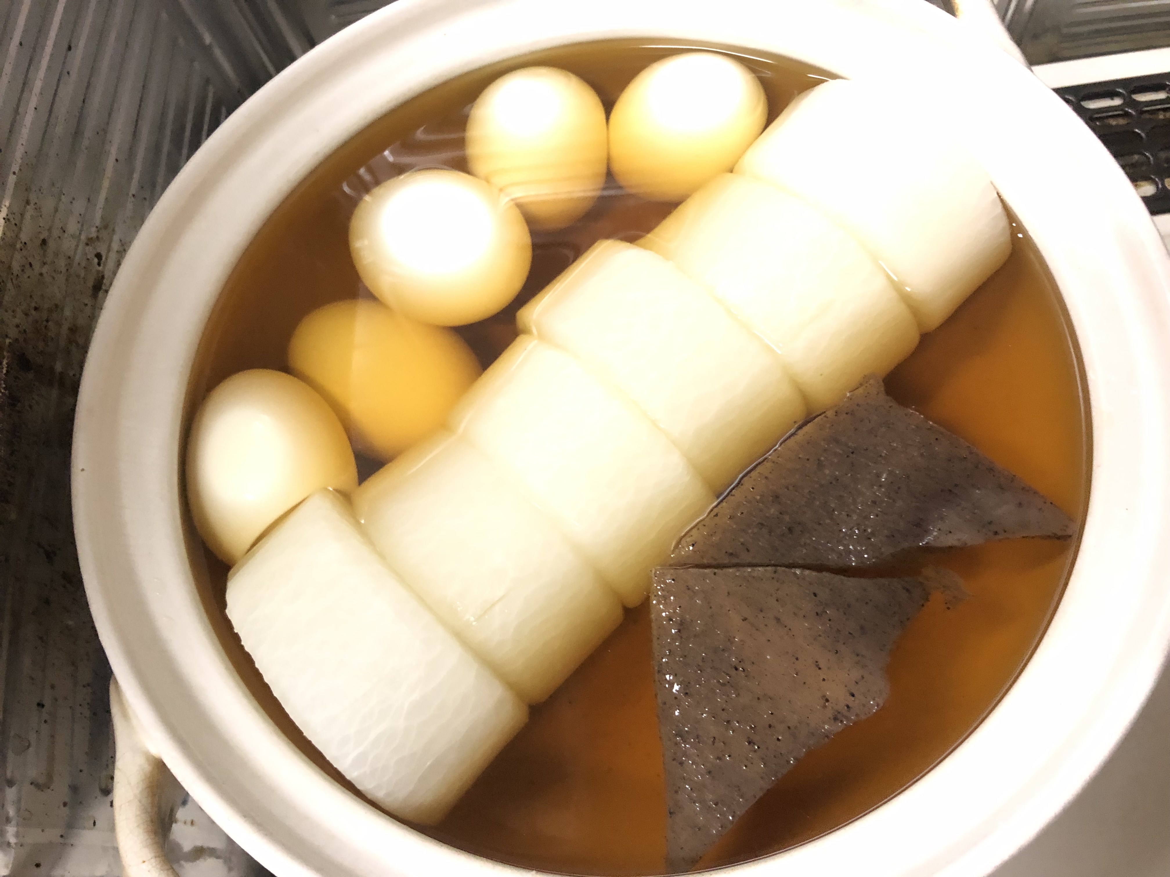 大根が冷めたら、あとはそれをおでんのダシに入れて煮込んでいきます。
